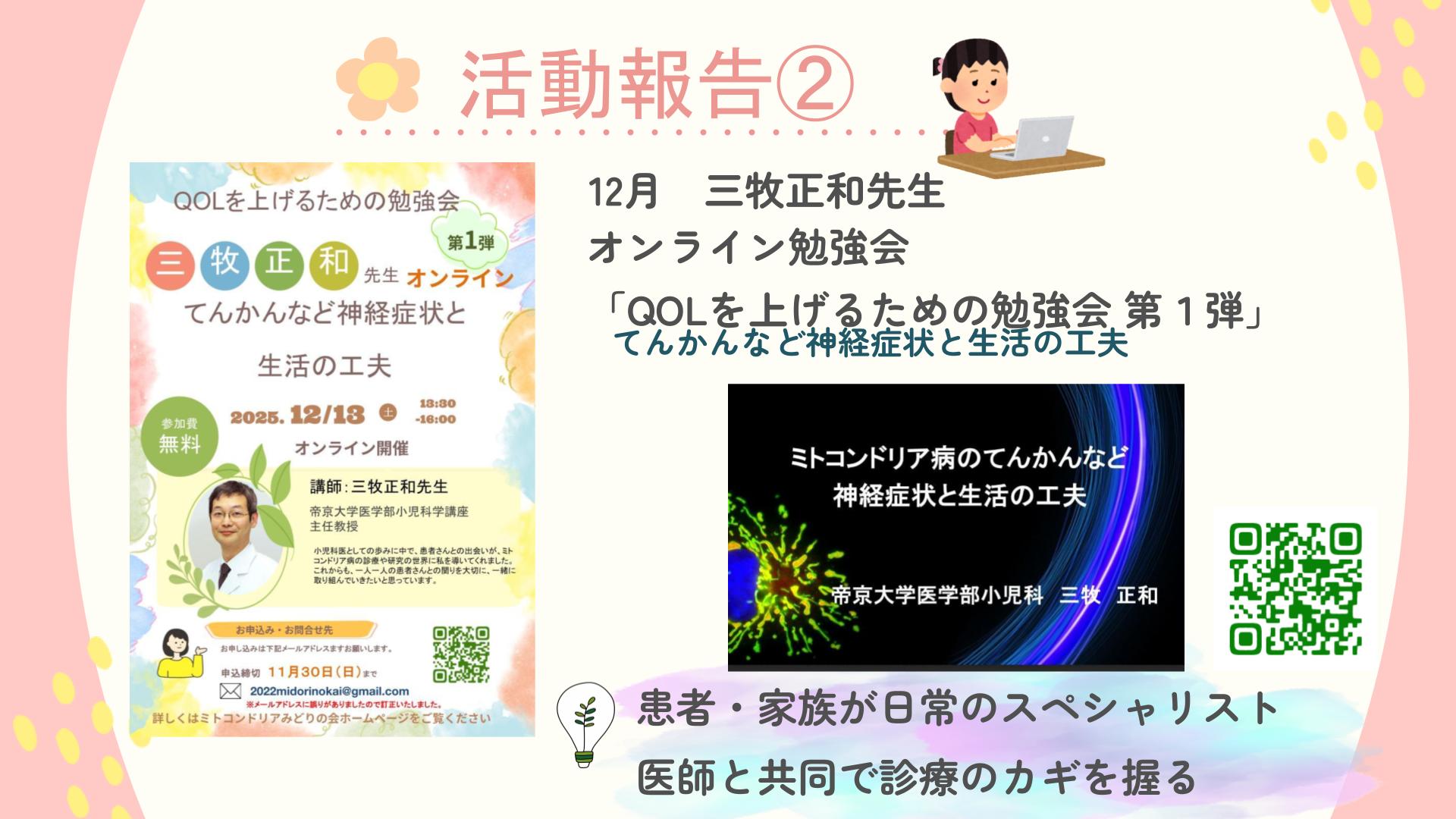 二つ目は、遺伝子診断と心のケアです。近年、遺伝子検査が保険適用となり、これまで専門施設でしか分からなかったミトコンドリア病が、一般の医療機関でも診断される時代になりました。この進歩に、患者・家族は大きな希望を感じています。一方で、遺伝子検査で「ミトコンドリア病」と診断されたものの、主治医の先生がこの疾患に詳しくなく、患者が十分な説明を受けられないまま不安の中に置かれてしまうケースも増えています。患者の多くは、診断後にインターネットで情報を探し、「難病」「進行性」「予後不良」といった言葉に強く心を痛めます。その時、医師から病気の本質や多様性について説明がないと、「自分の将来はどうなるのか」「何も分からない」という思いの中で、孤立した気持ちになってしまいます。遺伝子診断が広がった今だからこそ、一般診療に携わる医師の先生方にも、ミトコンドリア病の基本的な考え方や臨床的な特徴を共有していただけることが、患者の安心と適切な医療につながります。