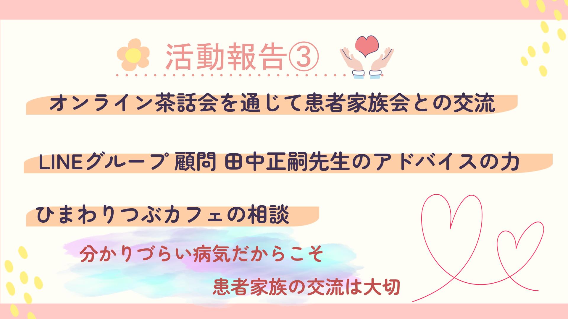 一つ目は、治験への配慮です。 ミトコンドリア病には、確立された治療薬がない中で、治験は私たち患者家族にとって、「明日への希望」そのものです。