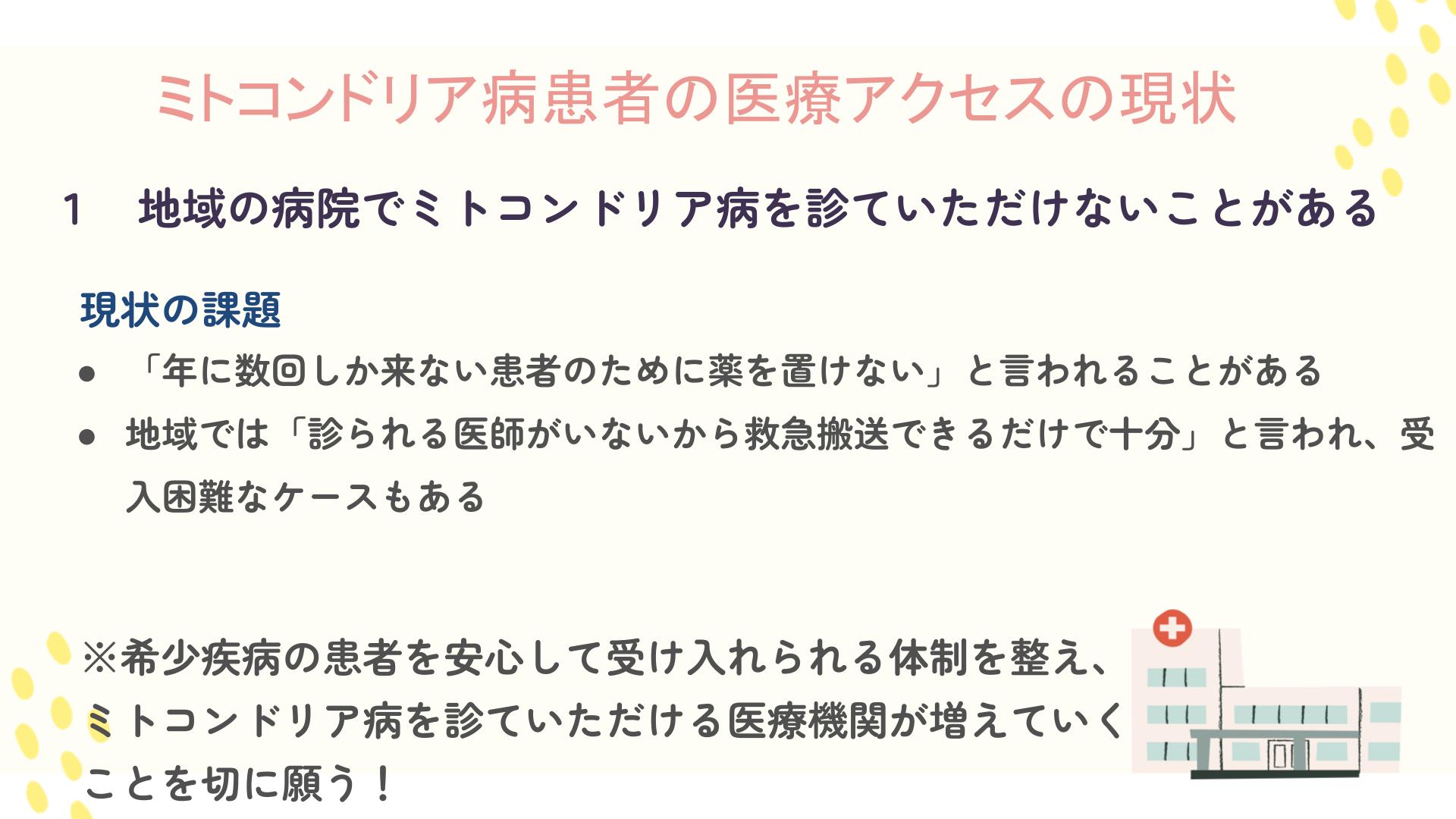 「地元の病院で診てもらえない」という悩みは後を絶ちません。「年に数回しか来ないミトコンドリア病患者のために、薬剤を備蓄することは病院の経営上できないと言われている」と医師が説明する基幹病院もあります。地元でかかりつけの病院先を探しても「ミトコンドリア病を診れる医師はどこにもいないのだから、救急搬送される病院があるだけで充分だ」と門前払いされることもあります。