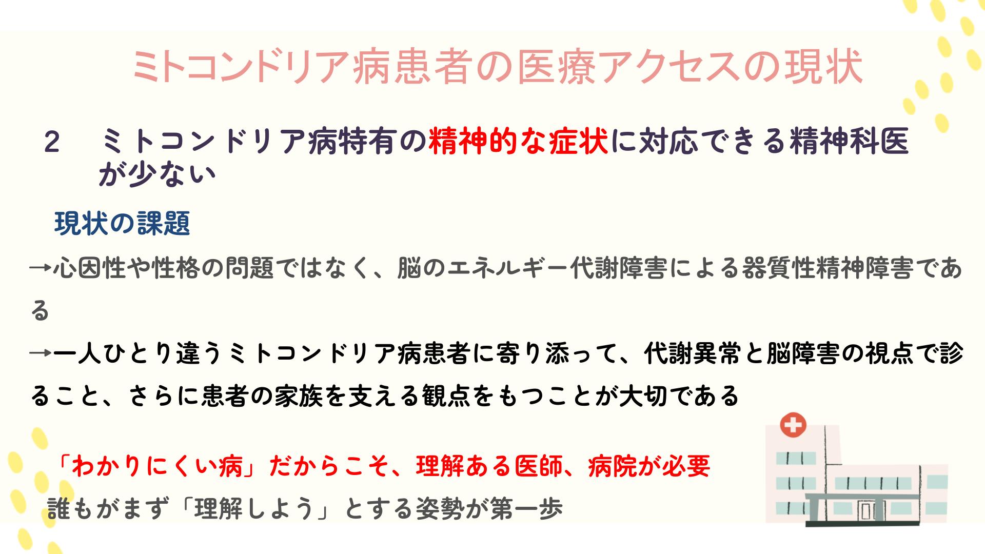 一人一人違う個性のミトコンドリア病患者に寄り添って、代謝異常と脳障害の視点で診てもらえる精神科医がとても大切だと思います。