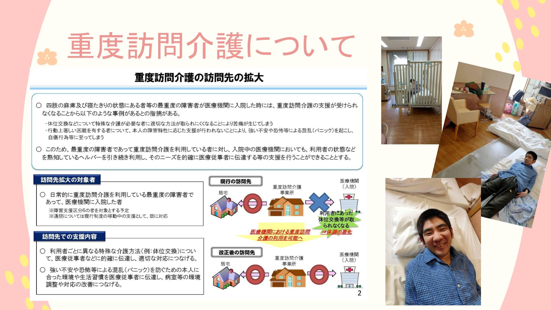 自宅での重度訪問介護については皆さんも御存知だと思いますが、病院や施設へも派遣要請ができるのをご存知でしょうか?
